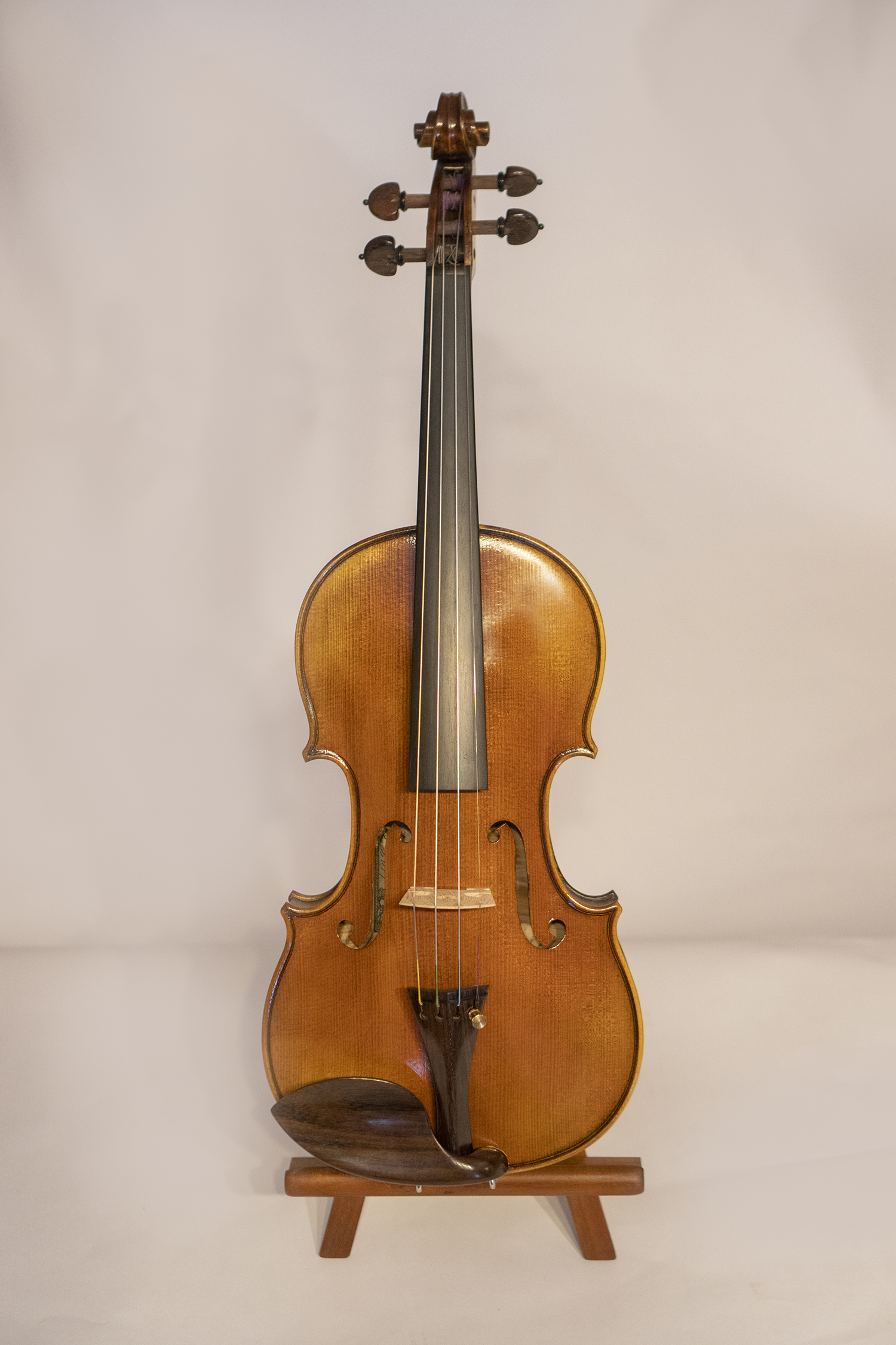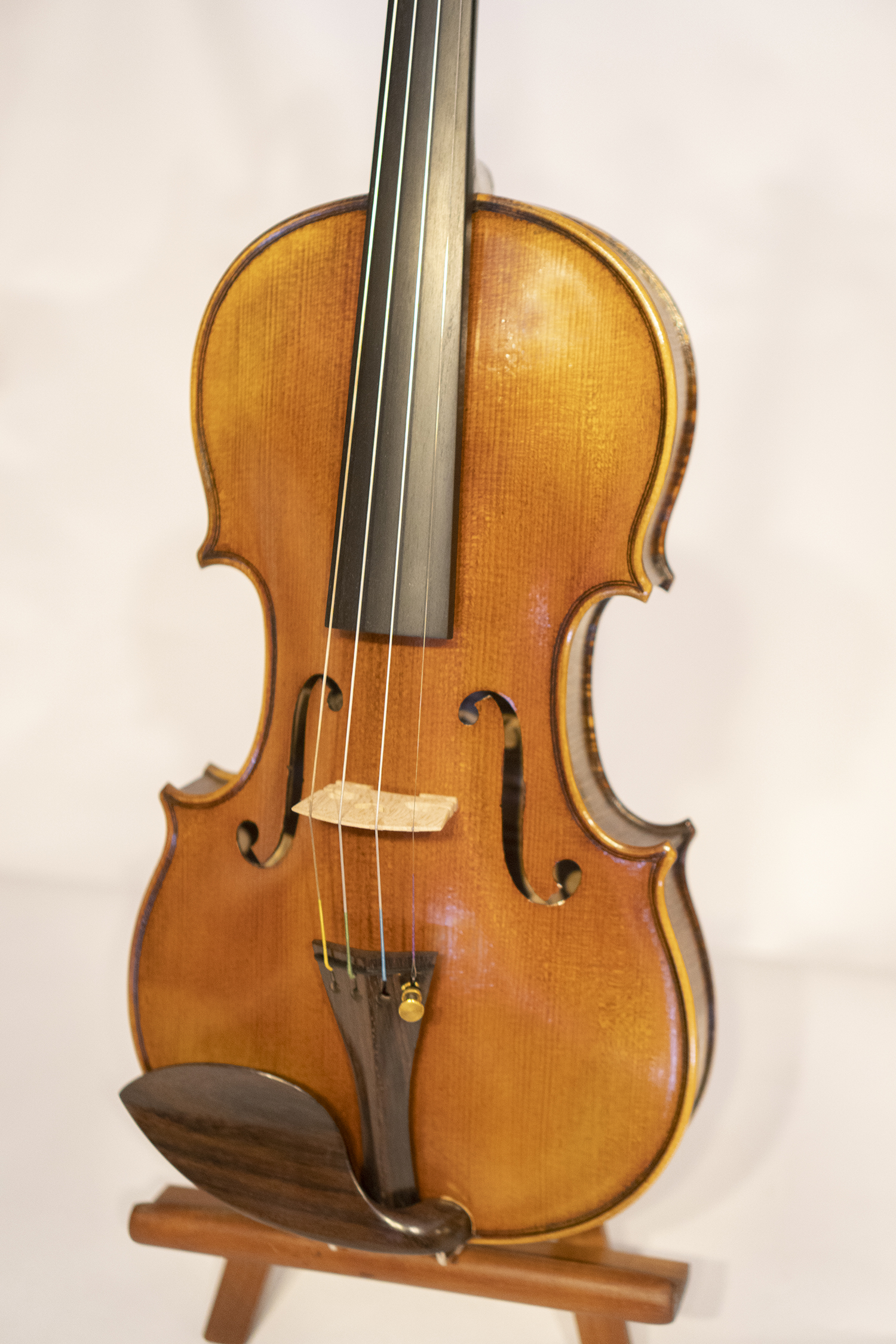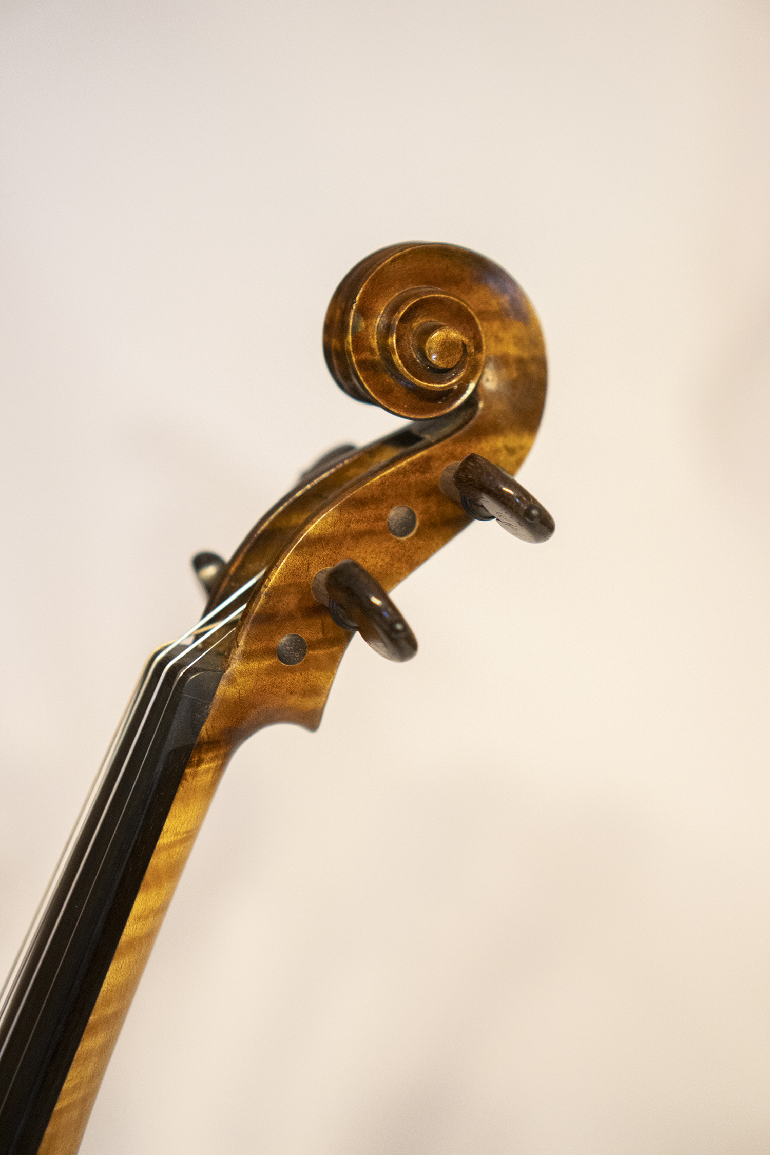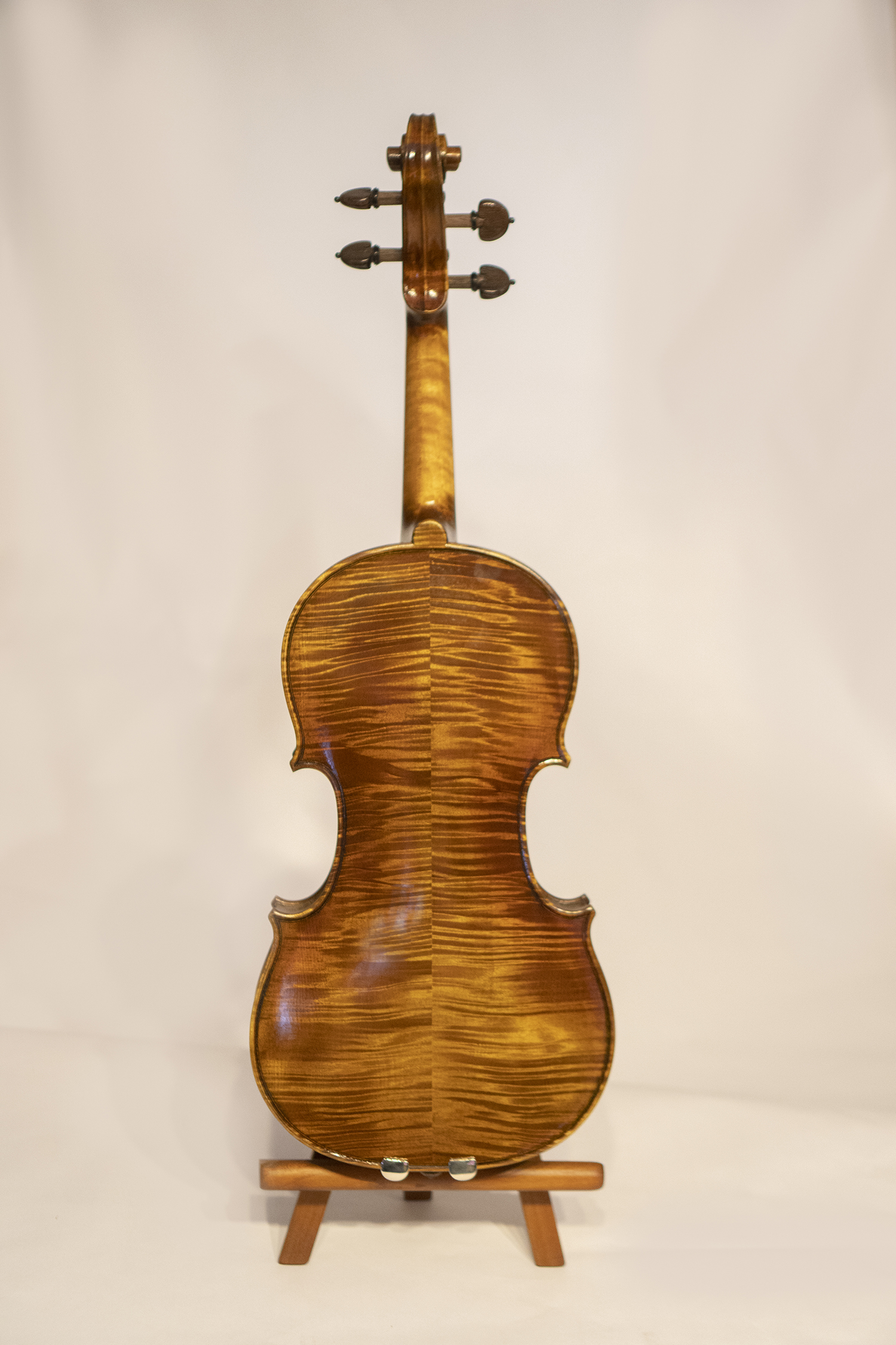 two piece back, highly flamed, golden deep brown with purfling, highlighted edges, dark rosewood heart-shaped pegs with black trim